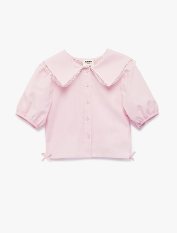 Dantel Detaylı Pamuklu Balon Kollu Fiyonklu Geniş Yaka Gömlek Sepete Ekle