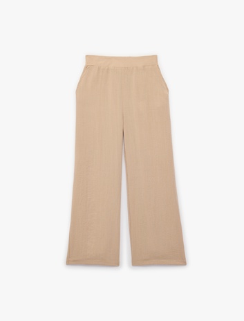 Beli Lastikli Yırtmaç Detaylı Dokulu Geniş Paça Pantolon Sepete Ekle