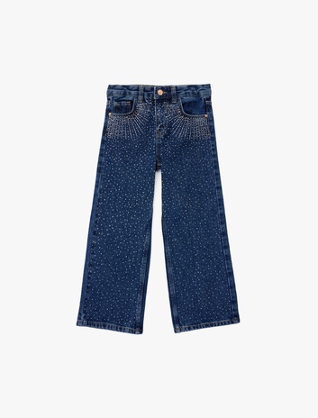Kız Çocuk Pamuklu Taş Detaylı Geniş Paça Denim Pantolon