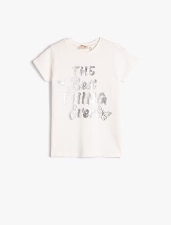Kız Çocuk Simli Baskılı Kısa Kollu Tişört Bisiklet Yaka Pamuklu
