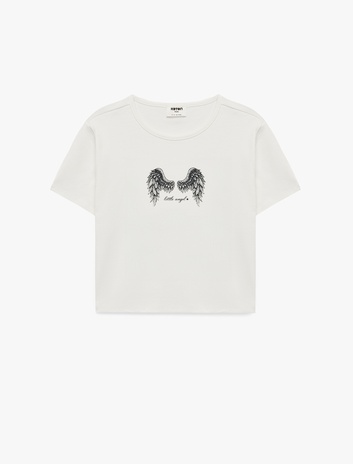 Baskılı Kısa Kollu Bisiklet Yaka Pamuklu Crop Tişört Sepete Ekle