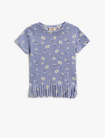 Kız Çocuk Püsküllü Tişört Çiçekli Bisiklet Yaka Kısa Kollu Pamuklu