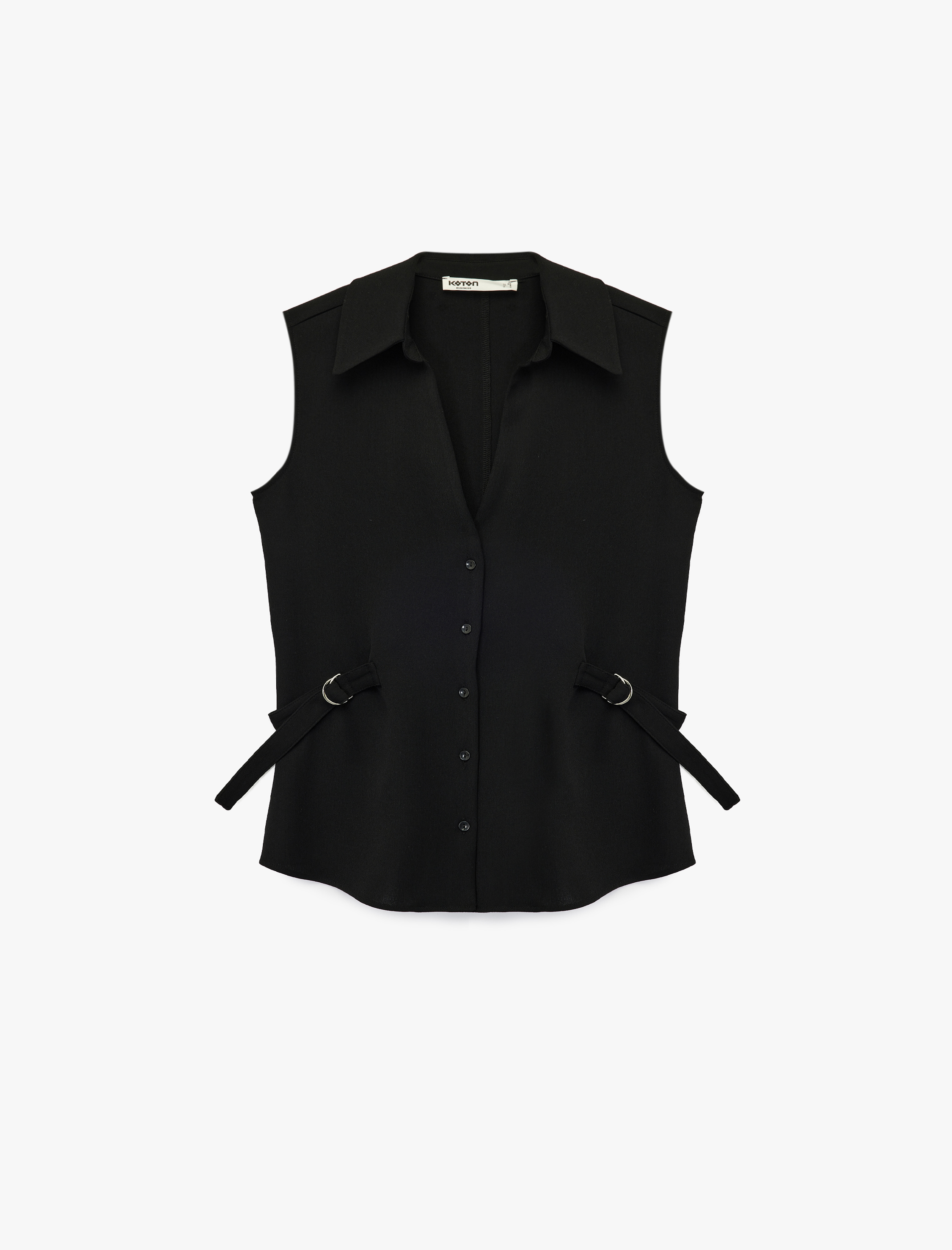 Klasik Yaka Yarım Kemer Detaylı Krep Kolsuz Gömlek