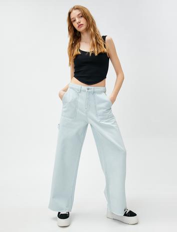 Yüksek Bel Düz Paça Cepli Düğmeli Jean Pantolon - Straight Fit Jean