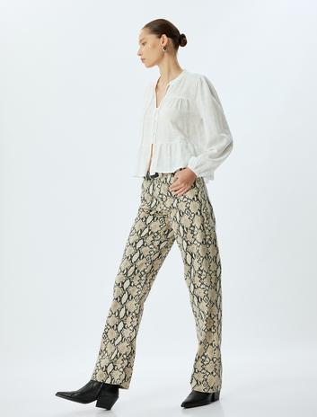 Yılan Derisi Görünümlü Düz Paça Düğmeli Pantolon - Straight Fit Jean