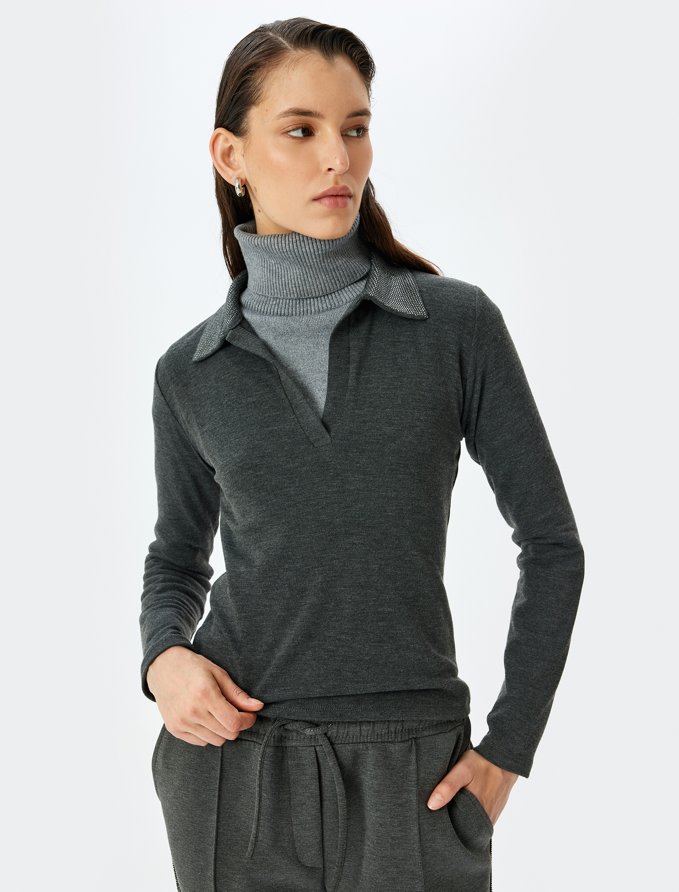 Koton X Şahika Ercümen - Uzun Kollu Taşlı Polo Yaka Triko Kazak