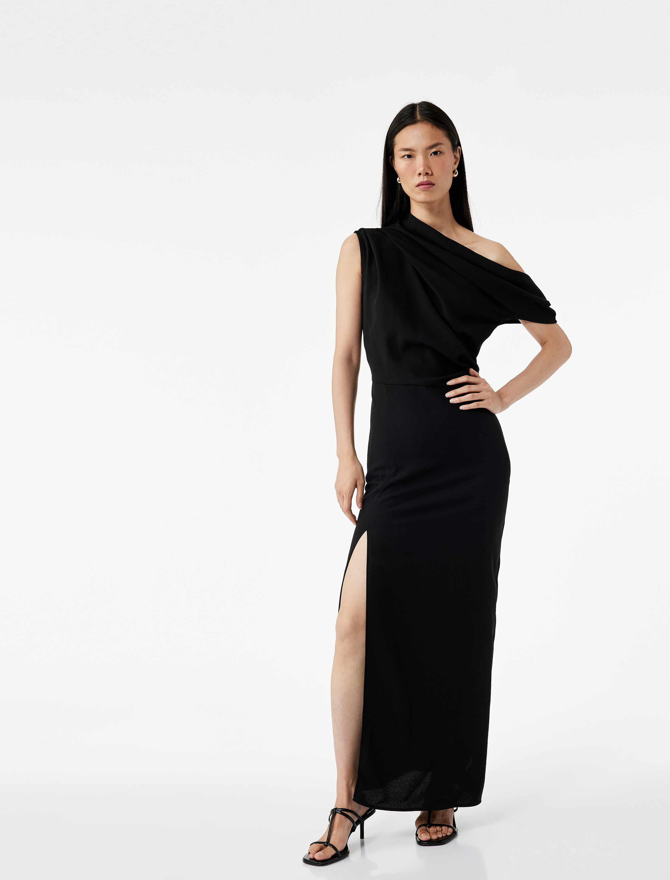 Krep Kumaş Asimetrik Kesim Drapeli Yırtmaçlı Midi Boy Tek Omuz Elbise