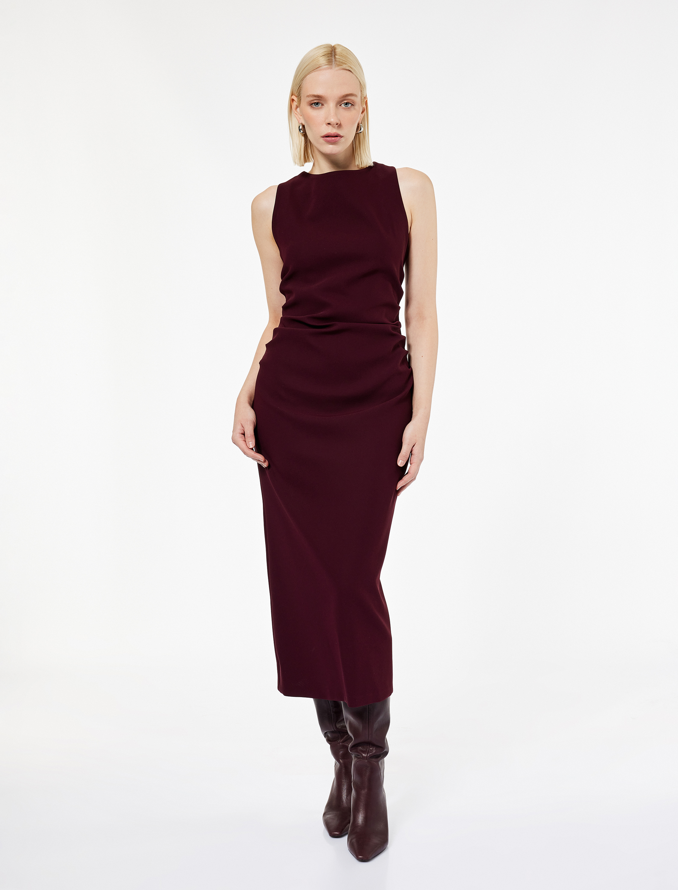 Krep Kumaş Drape Detaylı Yırtmaçlı Kolsuz Bisiklet Yaka Midi Kalem Elbise