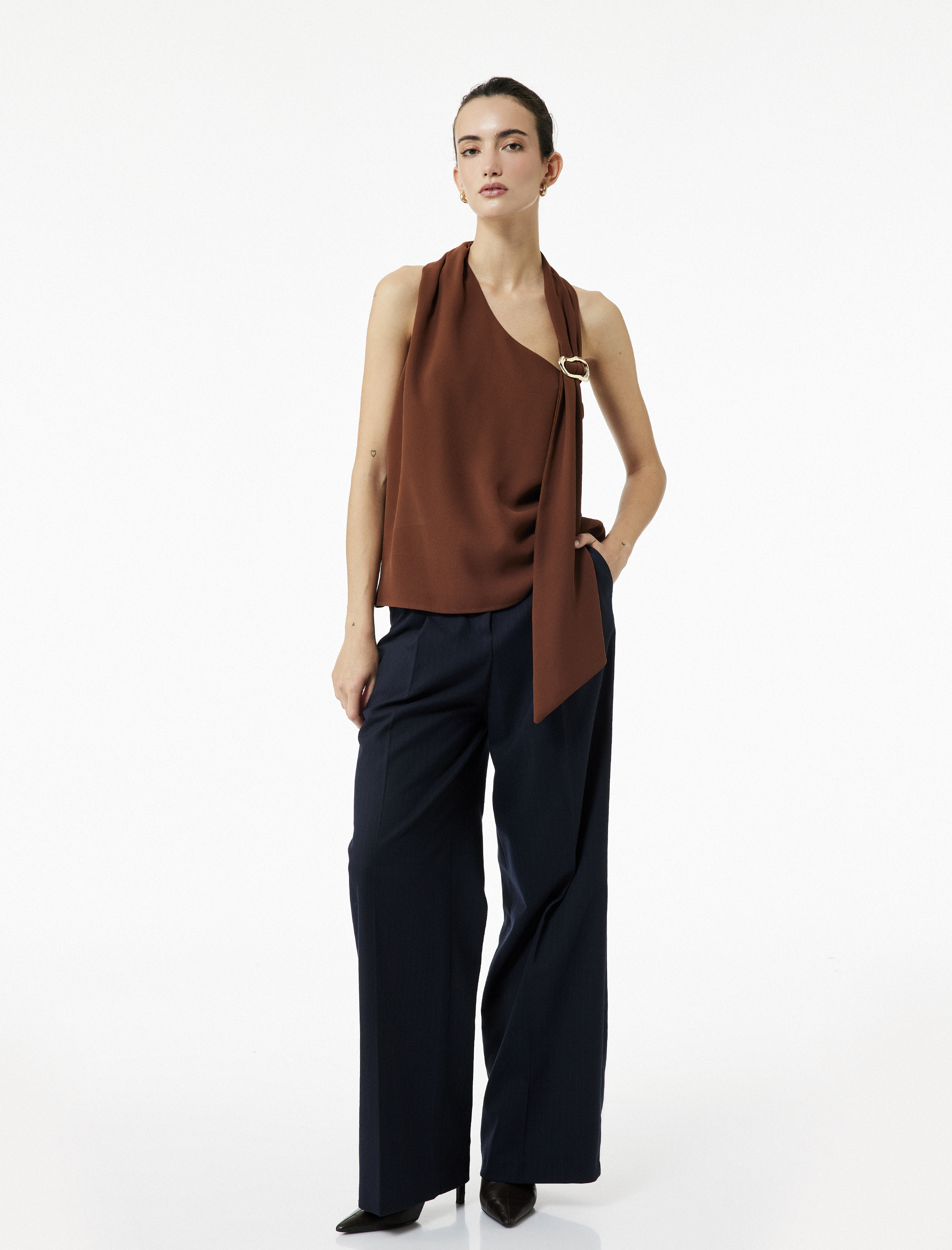 Krep Kumaş Metal Aksesuarlı Asimetrik Halter Yaka Kolsuz Bluz