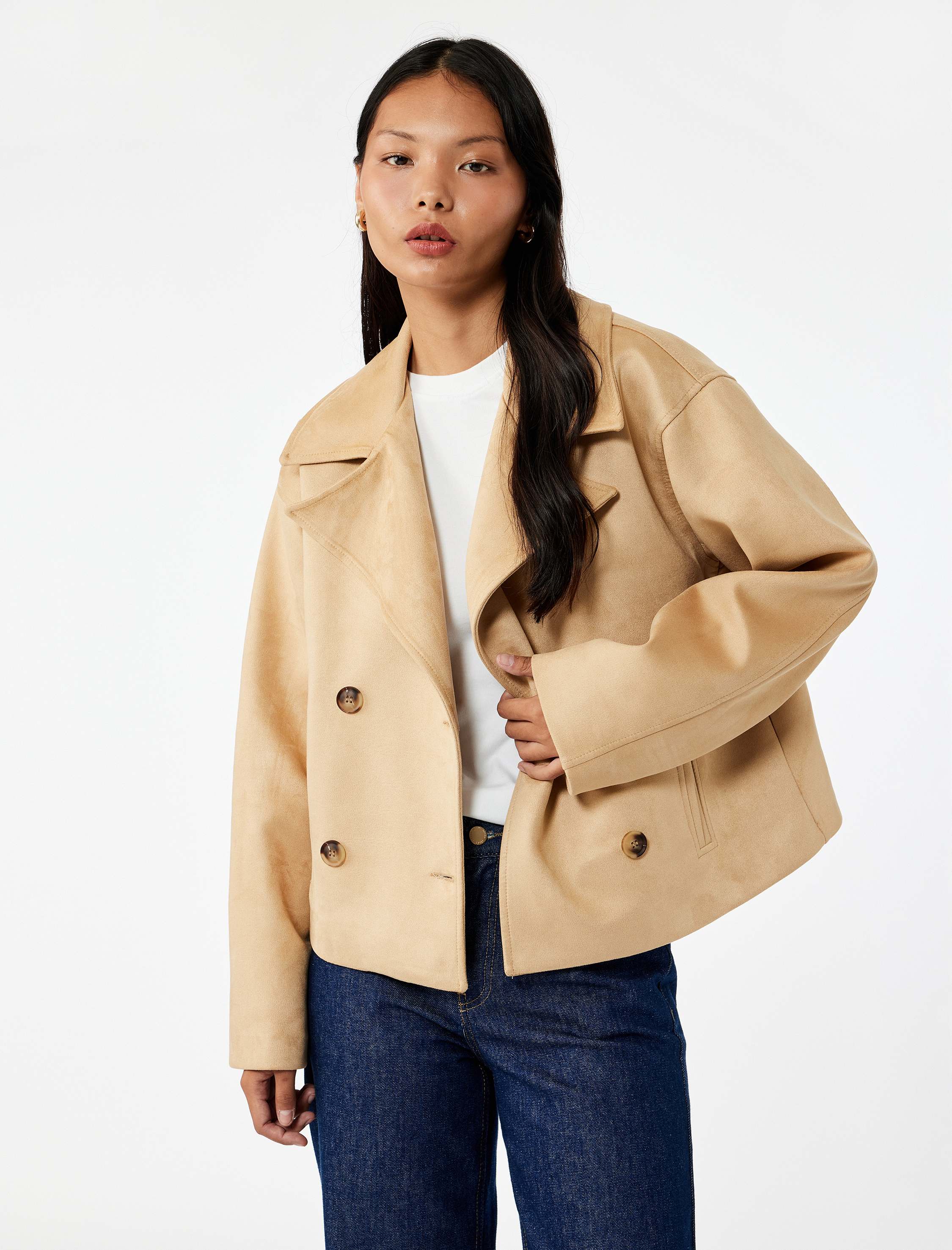 Kruvaze Yaka Düğmeli Cep Detaylı Uzun Kollu Suni Süet Ceket