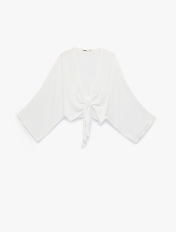 Kruvaze Yaka Beli Bağcıklı Kimono Kol Bluz Sepete Ekle