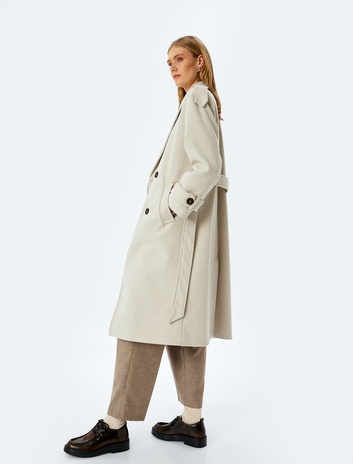 Koton X Sibil Çetinkaya - Cepli Düğmeli Kruvaze Ekstra Uzun Kaşe Kaban Sepete Ekle