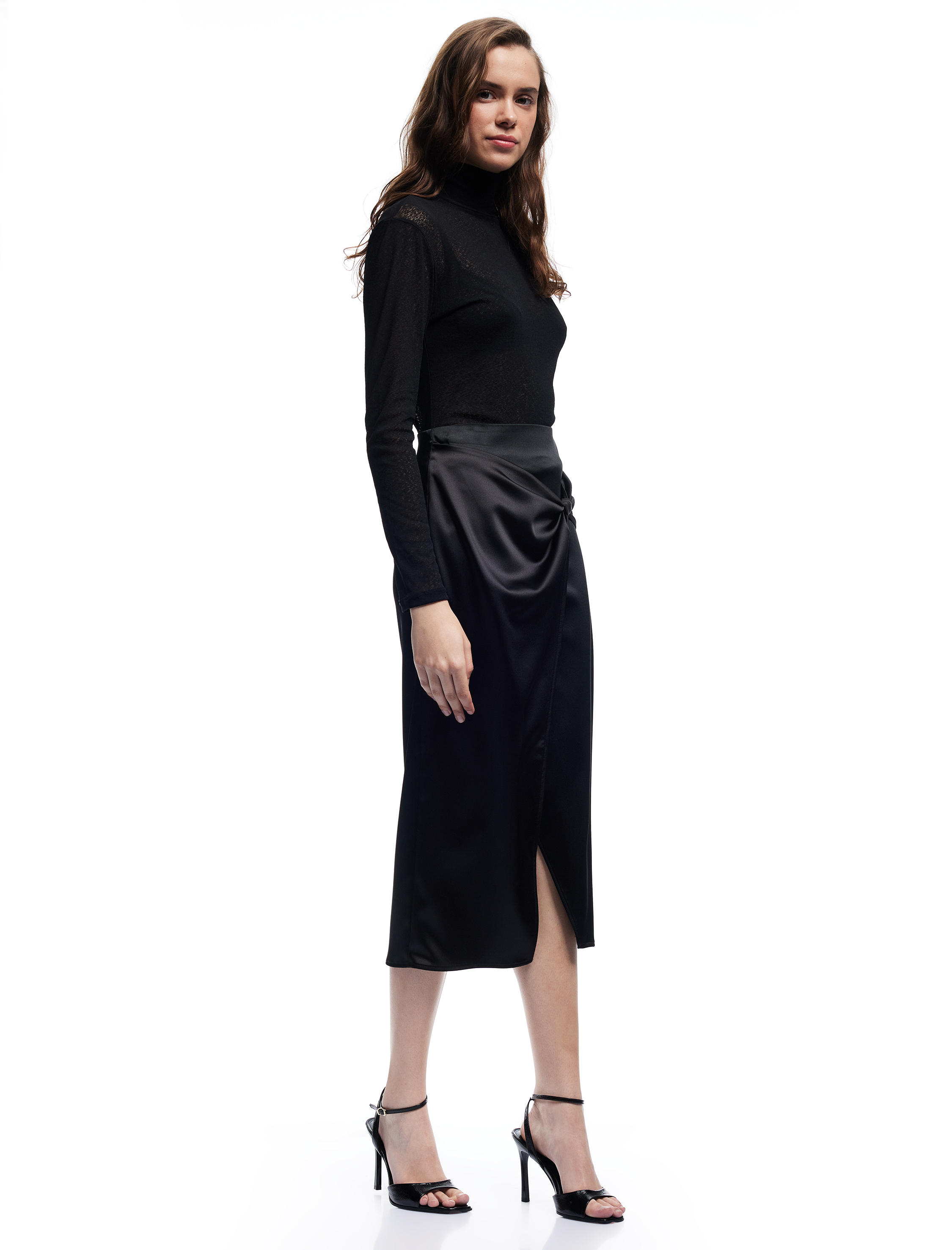 Kruvaze Yırtmaç Detaylı Slim Fit Saten Midi Etek