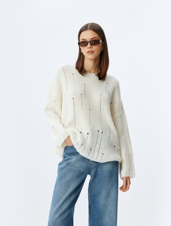 Bisiklet Yaka Yıpratılmış Uzun Kollu Rahat Kalıp Triko Kazak