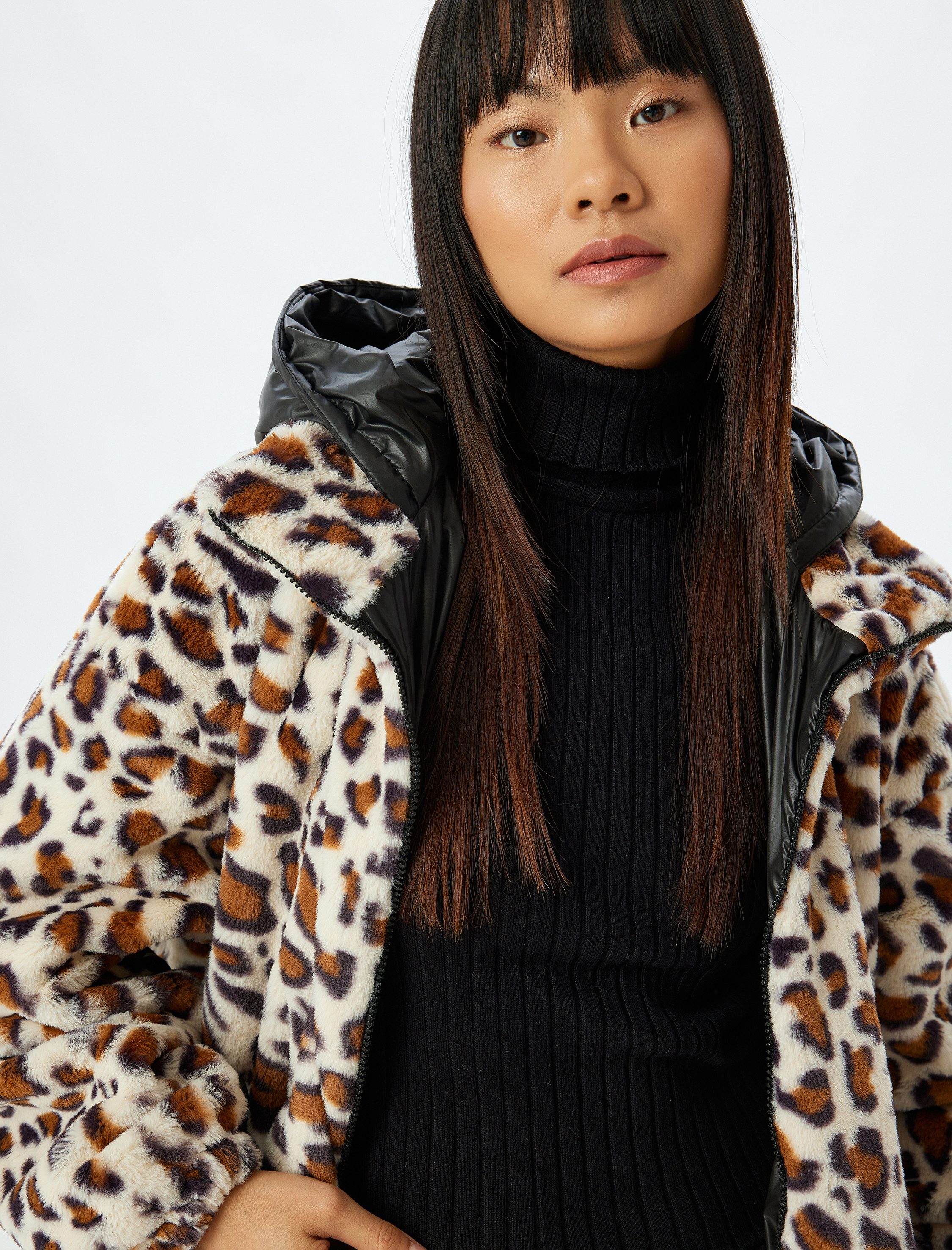 Leopar Ceket Oversize Suni Kürk Detaylı Kapüşonlu Fermuarlı Cepli Astarlı