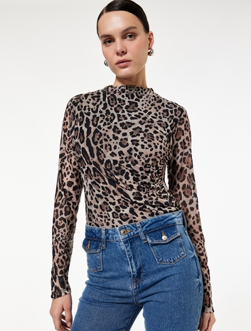 Uzun Kollu Yarı Transparan Drapeli Dik Yaka Leopar Desenli Tül Bluz Sepete Ekle