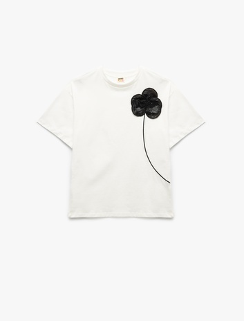 Pamuklu Çiçek Aplikeli Kısa Kollu Bisiklet Yaka Tişört Sepete Ekle
