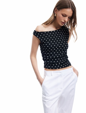 Büzgü Detaylı Slim Fit Asimetrik Yaka Puantiyeli Bluz Sepete Ekle