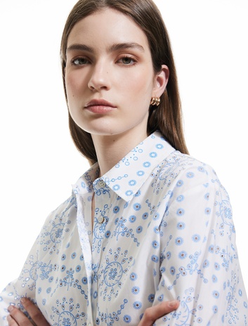 Pamuklu 3/4 Kol Klasik Yaka Etnik Desenli Uzun Poplin Gömlek