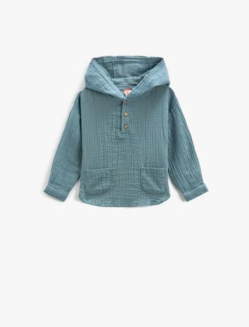 Müslin Sweatshirt Kapşonlu Uzun Kollu  Düğmeli Cepli Sepete Ekle