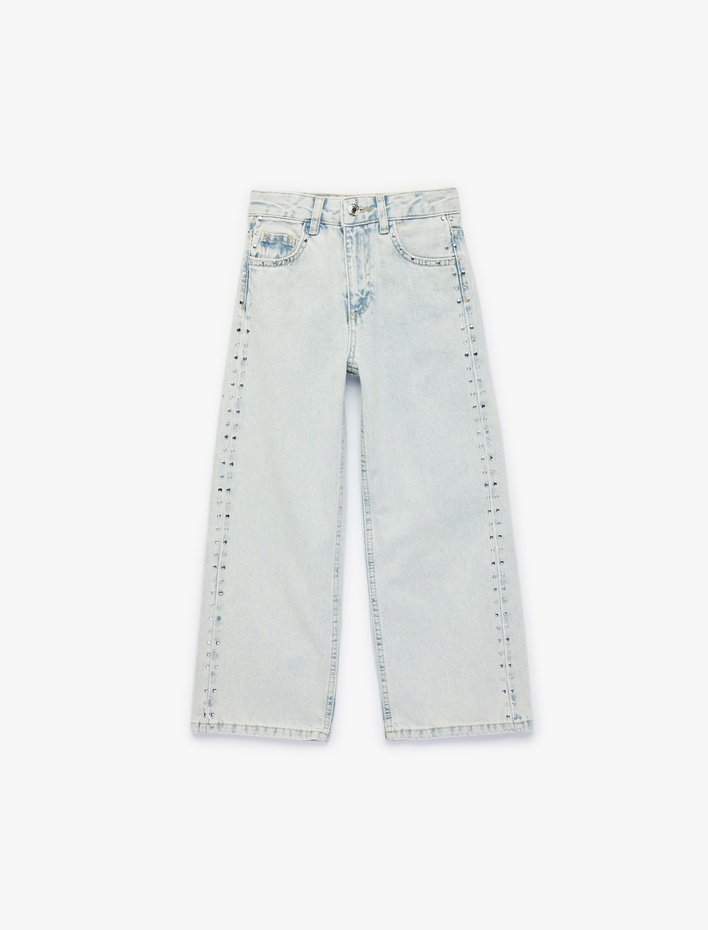 Taş Detaylı Düz Paça Cepli Düğmeli Straight Jean Pantolon - Straight Jeans