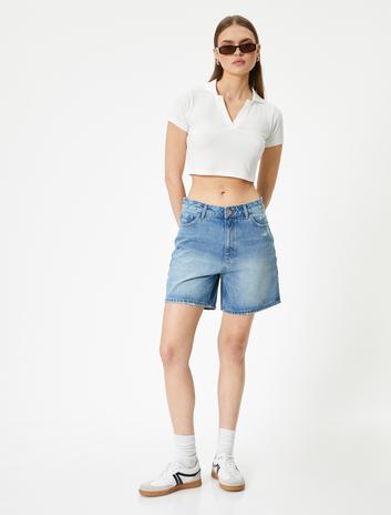 Bermuda Kot Şort Düz Kesik Paça Cepli Pamuklu