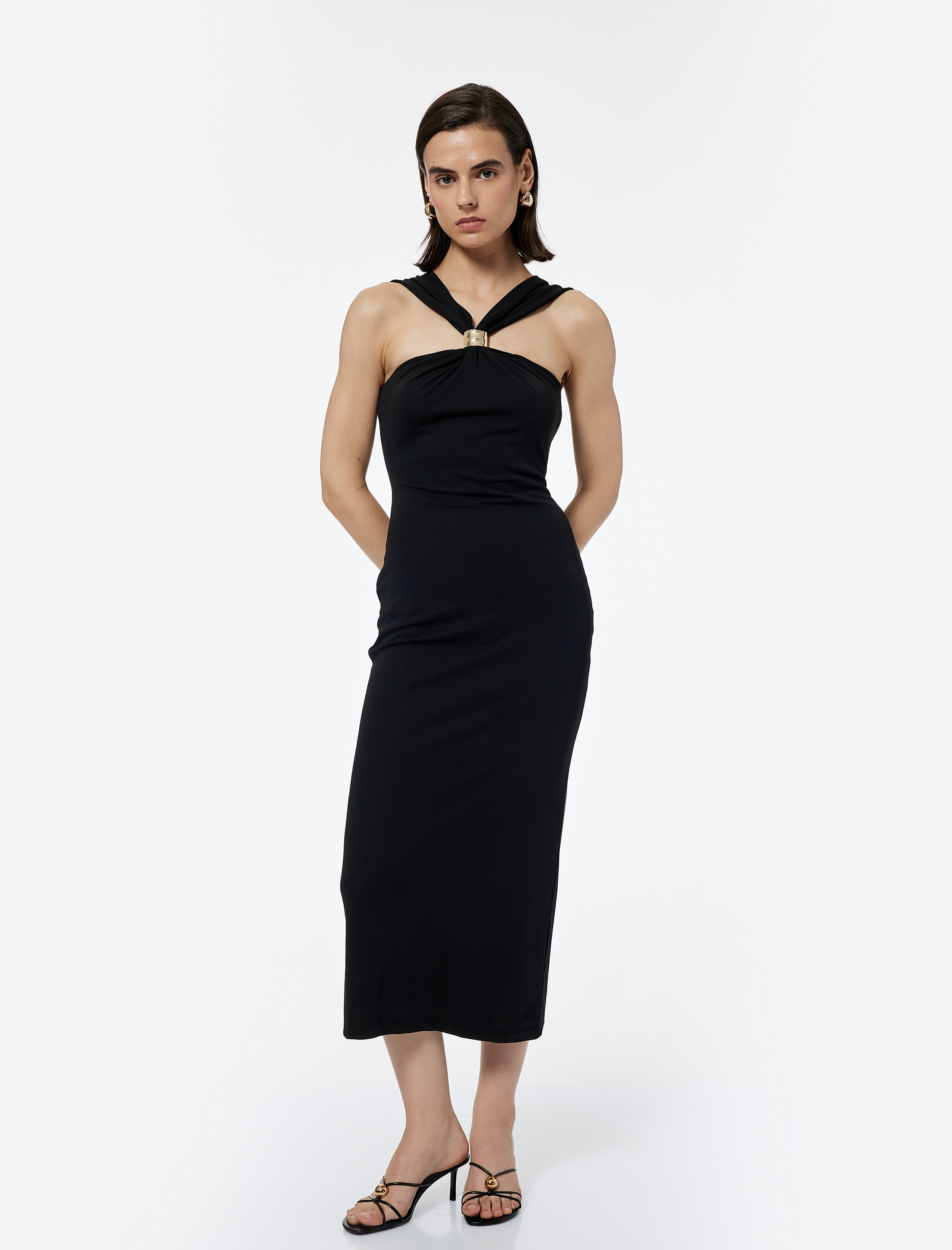 Metal Aksesuarlı Kare Yaka Kolsuz Uzun Abiye Elbise