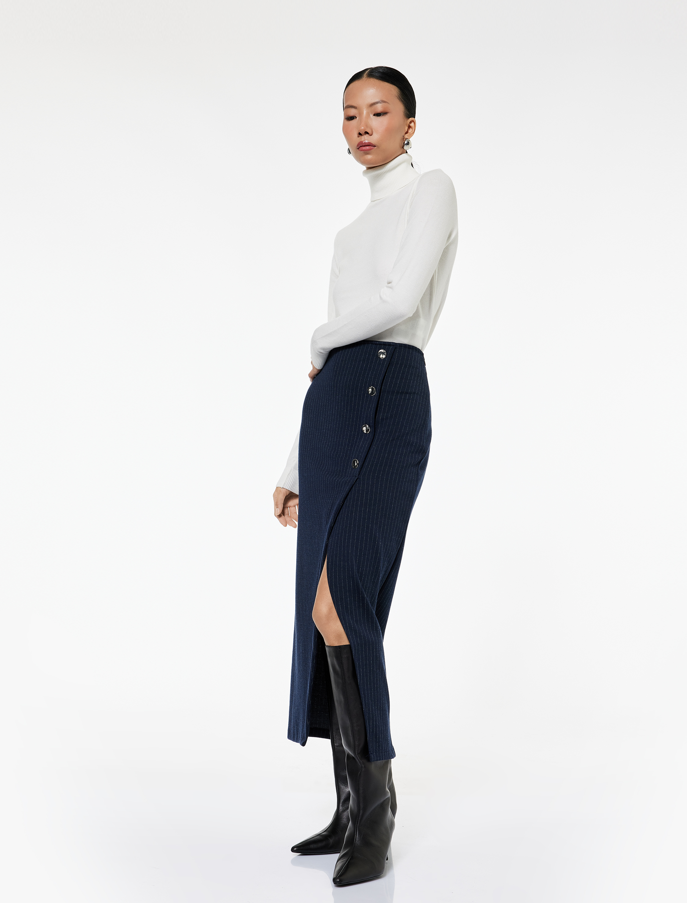 Metal Düğmeli Slim Fit Asimetrik Yırtmaçlı Çizgili Midi Etek