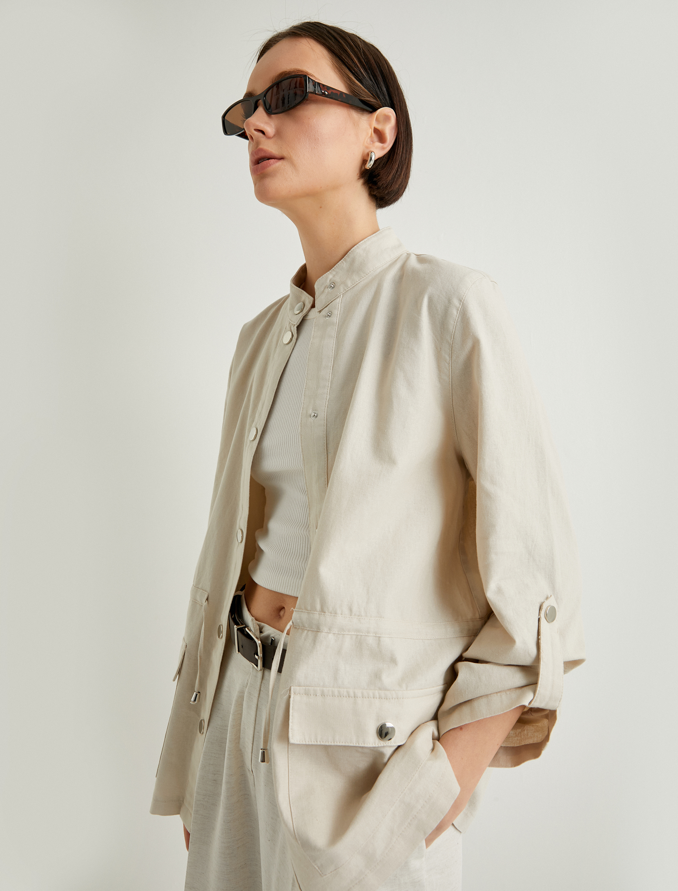 Mevsimlik Ceket Keten Karışımlı Dik Yaka Çıtçıt Kapama Katlamalı Kollu