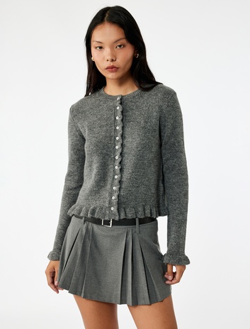 Fırfır Detaylı Uzun Kollu Bisiklet Yaka Düğmeli Triko Hırka