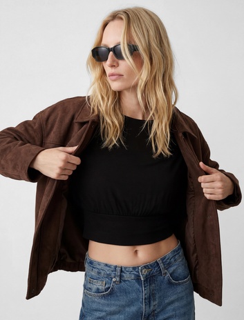 Uzun Kollu Cepli Düğmeli Süet Görünümlü Crop Ceket