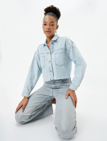 Taşlı Kot Ceket Aplike Cep Detaylı Rahat Kesim Gömlek Yaka Pamuklu