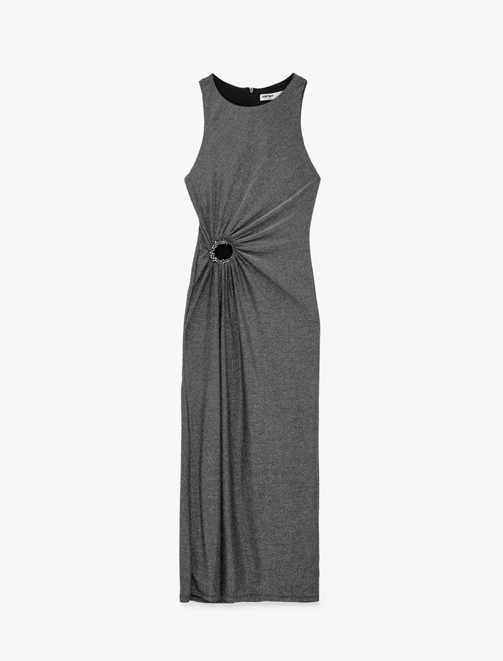 Yuvarlak Yaka Drape Detaylı Kolsuz Simli Midi Kalem Elbise Sepete Ekle
