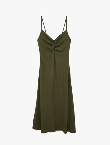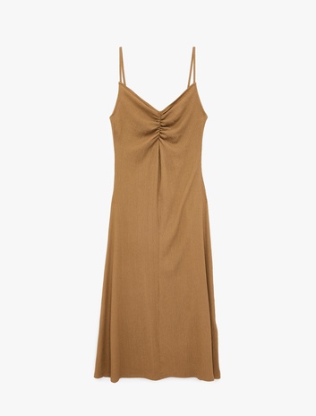 Bürümcük Kumaş Rahat Kalıp Büzgü Detaylı İp Askılı Midi Boy Elbise Sepete Ekle