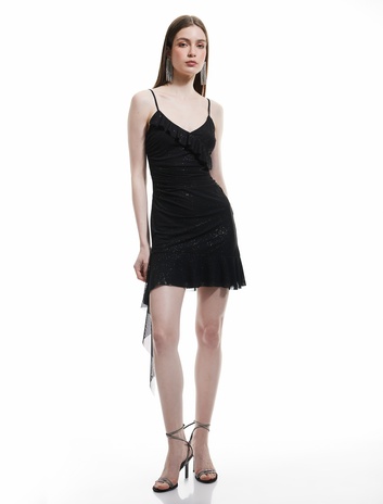 Mini Askılı V Yaka Simli Volanlı Mini Elbise