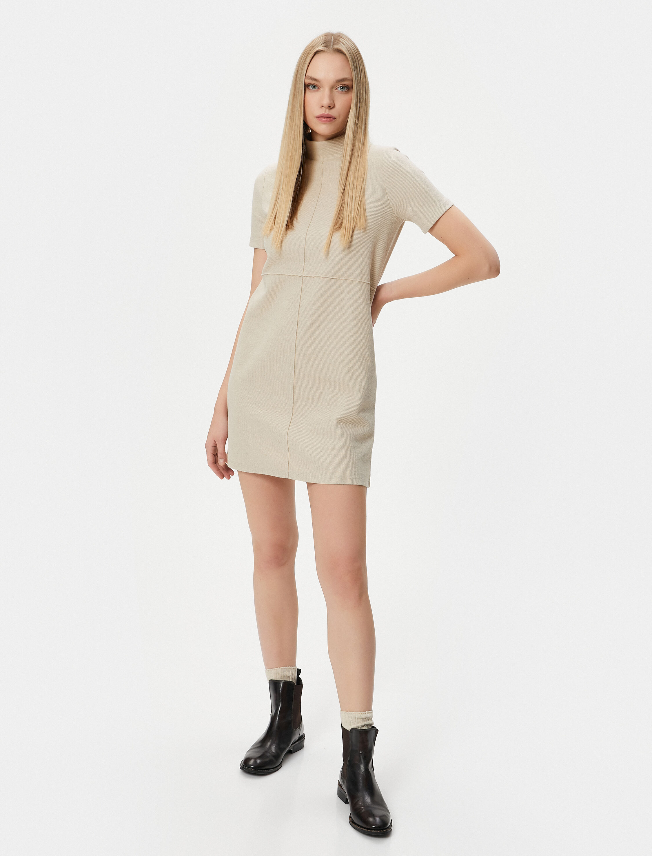 Mini Triko Elbise Dik Yaka Kısa Kollu
