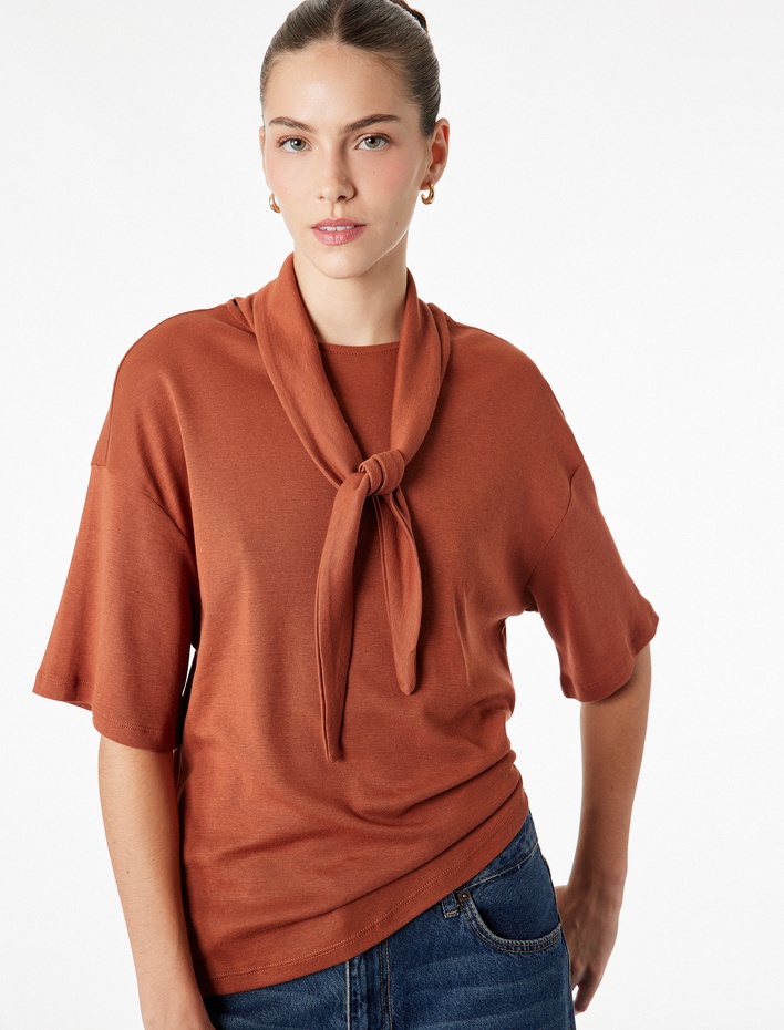 Modal Kumaş Kısa Kollu Fular Yaka Detaylı Tişört Sepete Ekle