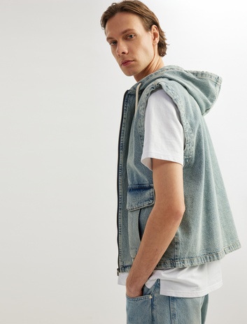 Kapüşonlu Fermuarlı Kapaklı Cepli Oversize Pamuklu Kolsuz Denim Yelek