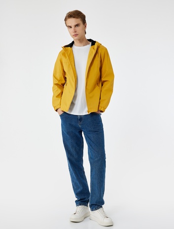 Uzun Kollu Fermuarlı Cep Detaylı Su İtici Kapşonlu Yağmurluk
