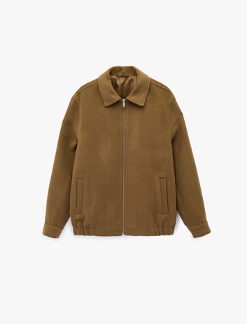 Regular Fit Uzun Kollu Cepli Gömlek Yaka Fermuarlı Kaşe Bomber Ceket
