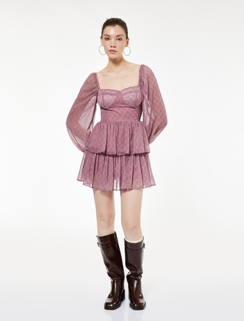Kare Yaka Balon Kollu Katlı Volanlı Gipeli Mini Şifon Elbise