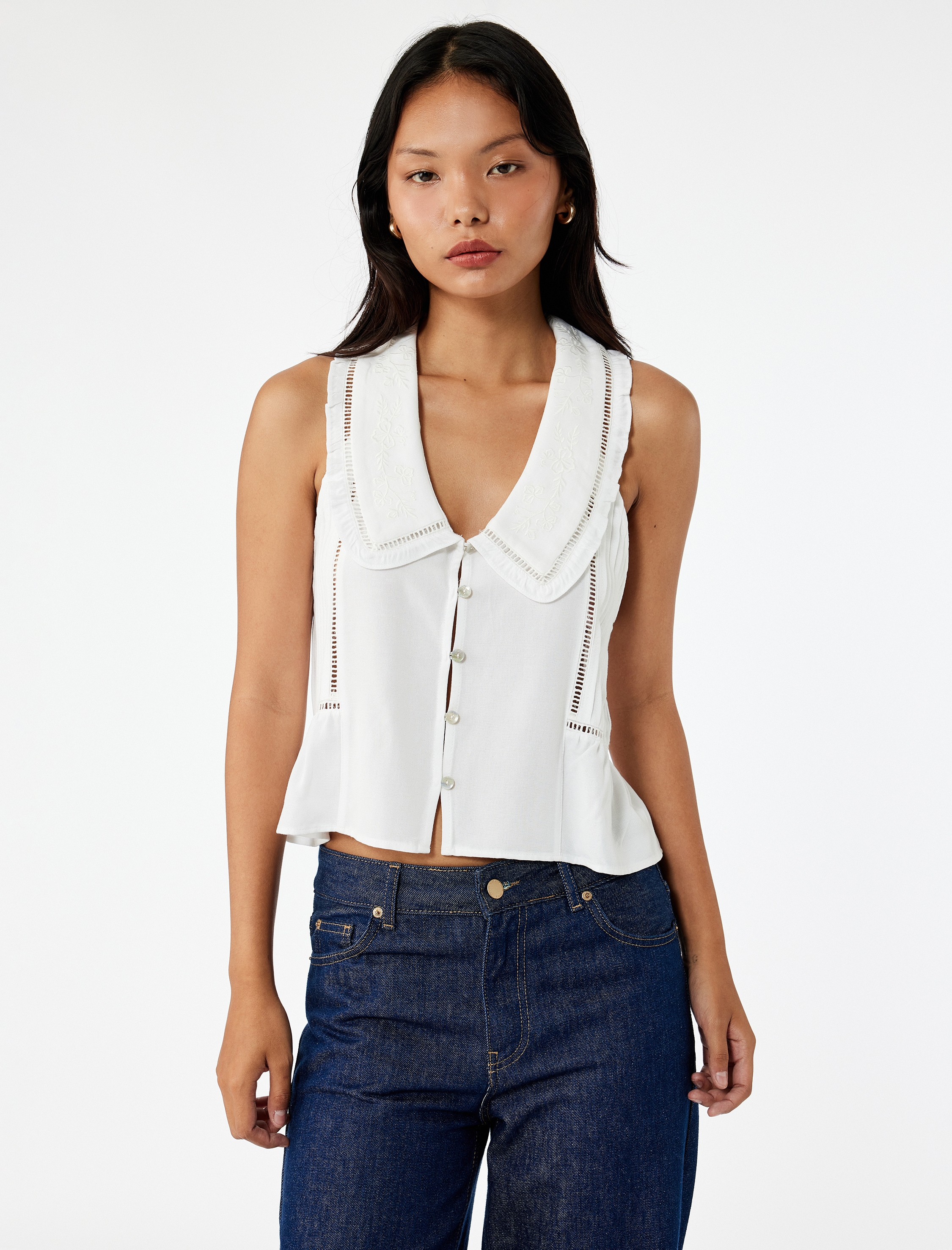 Nakış Detaylı Düğmeli Kolsuz Bebe Yaka Viskon Bluz