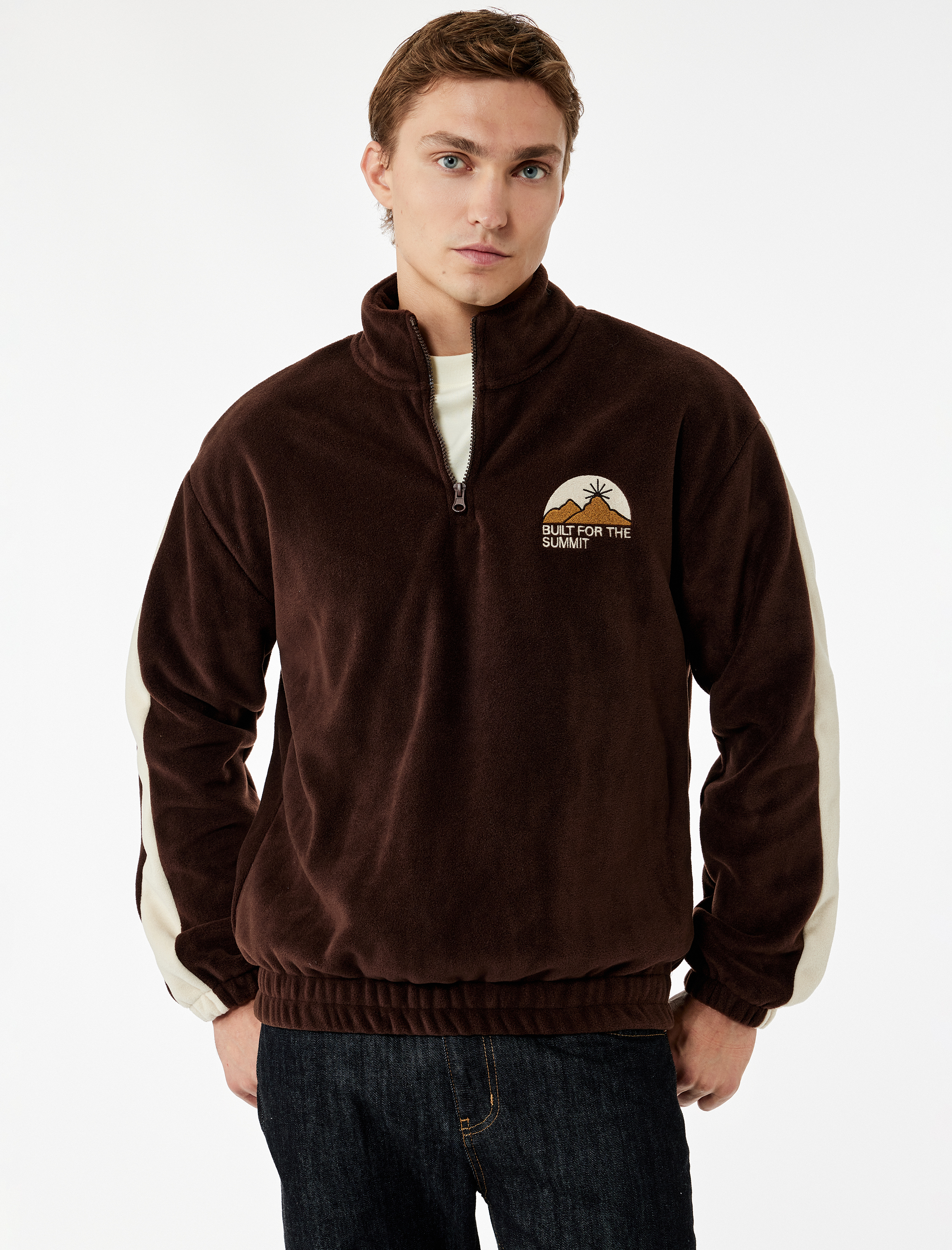 Nakışlı Uzun Kollu Renk Bloklu Yarım Fermuarlı Polar Sweatshirt