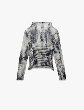 Slim Fit Uzun Kollu Geniş Dik Yaka Drape Detaylı Desenli Tişört Sepete Ekle