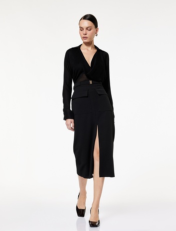 Metal Aksesuarlı Pencere Detaylı Asimetrik Yaka Uzun Kollu Krep Bluz Sepete Ekle