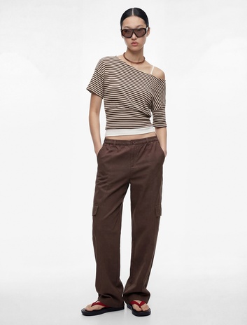 Viskon Karışımlı Omzu Açık Kısa Kollu Çizgili Tişört Sepete Ekle
