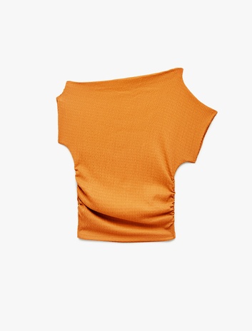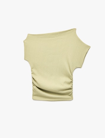 Bürümcük Kumaş Dokulu Drapeli Asimetrik Omzu Açık Kayık Yaka Bluz Sepete Ekle