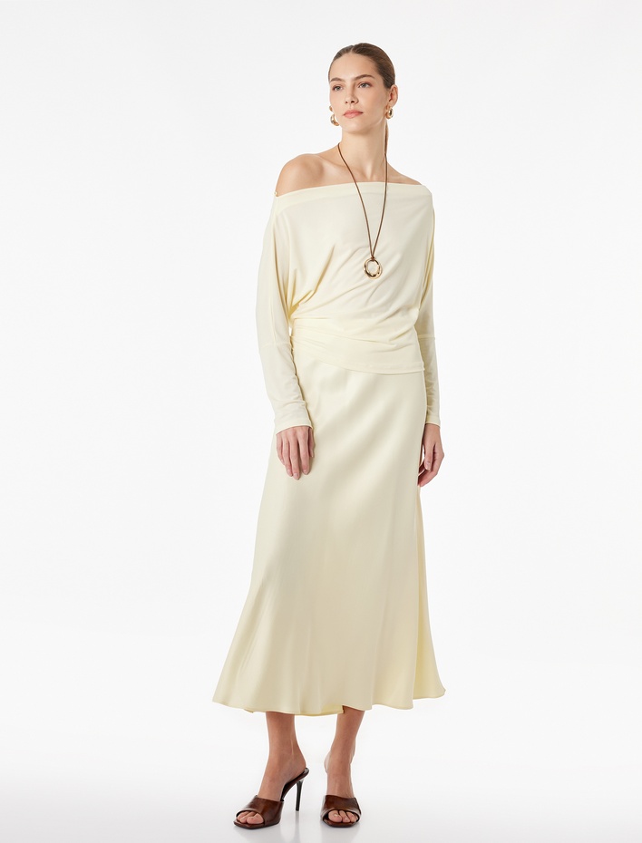 Slim Fit Drape Detaylı Uzun Kollu Madonna Yaka Omzu Açık Bodysuit