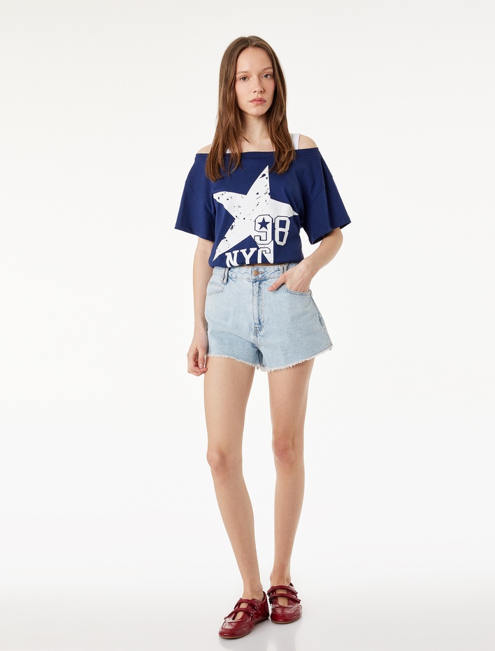 Rahat Kalıp Kısa Kollu Omzu Açık Baskılı Crop Tişört
