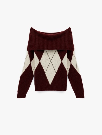 Uzun Kollu Omzu Açık Baklava Desenli Kazak Sepete Ekle